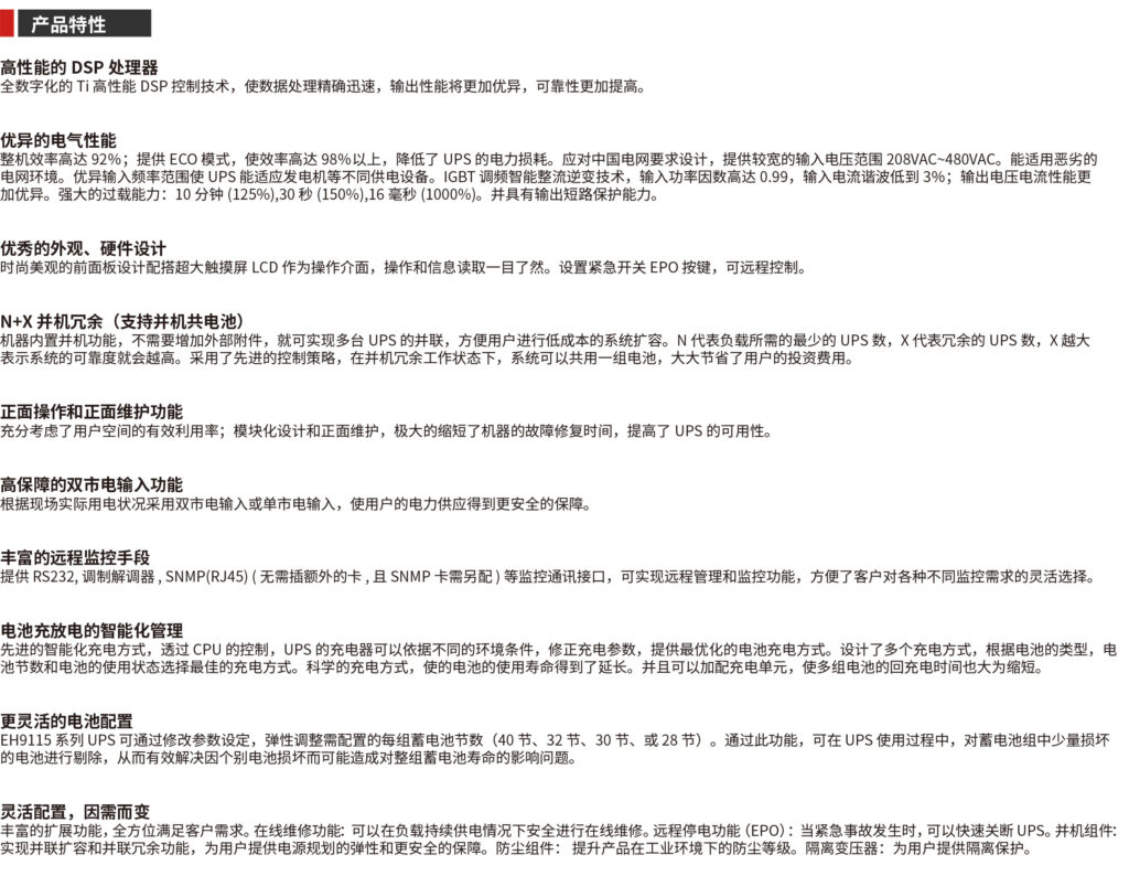 EH9115 系列產(chǎn)品采用了在線雙向轉(zhuǎn)換結(jié)構(gòu),逆變基于 IGBT,是三相高頻在線式 UPS。本產(chǎn)品適用于中小型數(shù)據(jù)中心、網(wǎng)絡(luò)管理中心、企業(yè)服務(wù)器機(jī)房等,對(duì)電壓瞬時(shí)跌落或減幅震蕩,高壓脈沖、電壓波動(dòng)、浪涌電壓、諧波失真、頻率波動(dòng)等狀況可提供良好的解決方案;可擴(kuò)展電源 / 與另一相同容量及品牌的 UPS 并聯(lián) / 強(qiáng)制通風(fēng)冗余 / 免疫相旋轉(zhuǎn)輸入 / 雙輸入型輸入(可選擇),為用戶的負(fù)載提供安全可靠的電源保障。