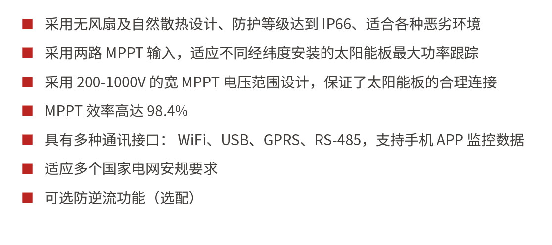 ■ MPPT 效率高達(dá) 98.4%■ 具有多種通訊接口: WiFi、USB、GPRS、RS-485,支持手機(jī) APP 監(jiān)控?cái)?shù)據(jù)■ 適應(yīng)多個(gè)國家電網(wǎng)安規(guī)要求