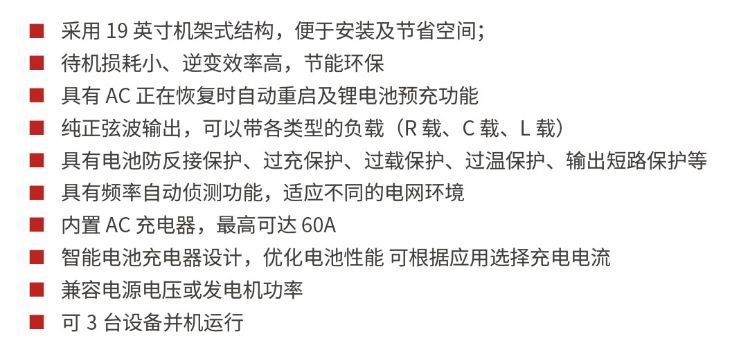 應(yīng)用領(lǐng)域: 廣泛應(yīng)用于通訊基站、企業(yè)機(jī)房、監(jiān)控系統(tǒng)及 DC-AC的供電系統(tǒng)。該系列產(chǎn)品特別適合與鋰電池配套使用。