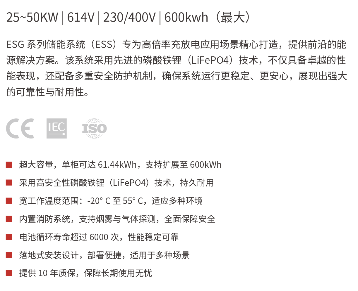 ESG 系列儲(chǔ)能系統(tǒng)(ESS)專為高倍率充放電應(yīng)用場(chǎng)景精心打造,提供前沿的能源解決方案。該系統(tǒng)采用先進(jìn)的磷酸鐵鋰(LiFePO4)技術(shù),不僅具備卓越的性能表現(xiàn),還配備多重安全防護(hù)機(jī)制,確保系統(tǒng)運(yùn)行更穩(wěn)定、更安心,展現(xiàn)出強(qiáng)大的可靠性與耐用性。