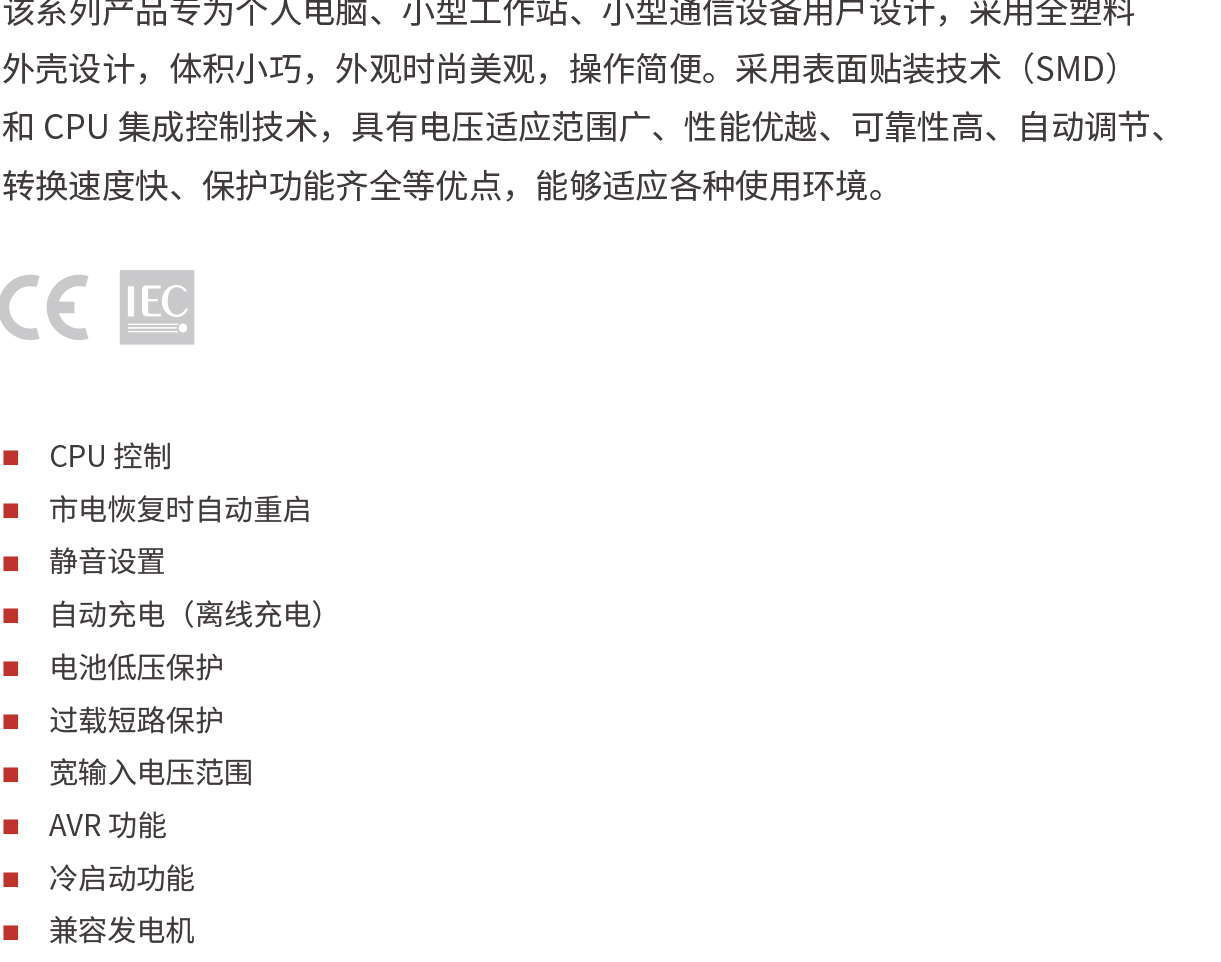 該系列產(chǎn)品專為個(gè)人電腦、小型工作站、小型通信設(shè)備用戶設(shè)計(jì),采用全塑料外殼設(shè)計(jì),體積小巧,外觀時(shí)尚美觀,操作簡便。采用表面貼裝技術(shù)(SMD)和 CPU 集成控制技術(shù),具有電壓適應(yīng)范圍廣、性能優(yōu)越、可靠性高、自動(dòng)調(diào)節(jié)、轉(zhuǎn)換速度快、保護(hù)功能齊全等優(yōu)點(diǎn),能夠適應(yīng)各種使用環(huán)境。