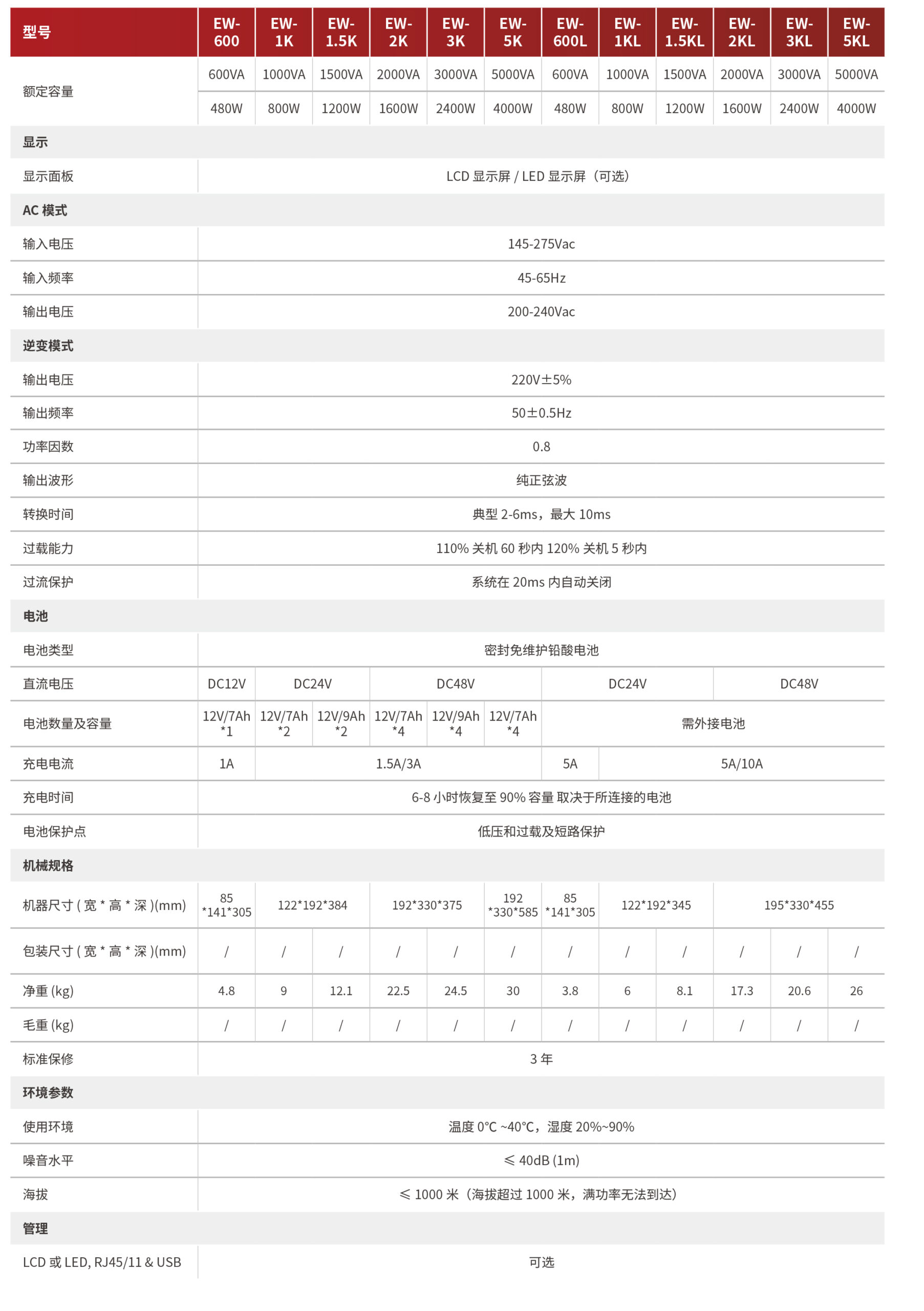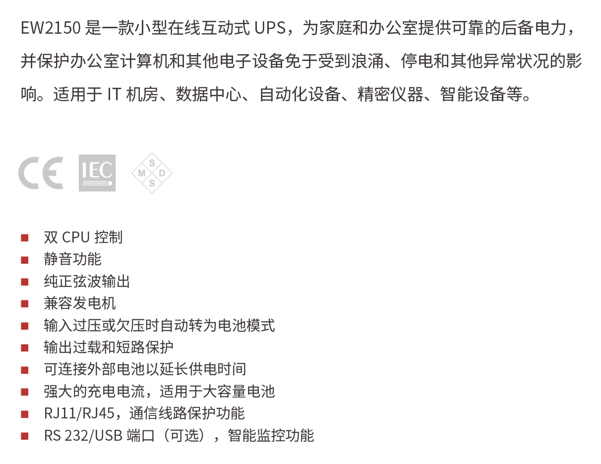 工作方式: EW2150 是一款小型在線互動式 UPS,為家庭和辦公室提供可靠的后備電力,并保護辦公室計算機和其他電子設(shè)備免于受到浪涌、停電和其他異常狀況的影響。適用于 IT 機房、數(shù)據(jù)中心、自動化設(shè)備、精密儀器、智能設(shè)備等。